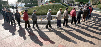 距離冬至只剩兩天的20日,老人們在釜山龍頭山公園排隊領取免費的冬至豆粥。當天,大韓紅十字會釜山支社和三星電子釜山工廠向350名沒有依靠的低收入老人免費提供了豆粥。寒冷的冬天只有陽光陪伴的老人們越發顯得孤獨。