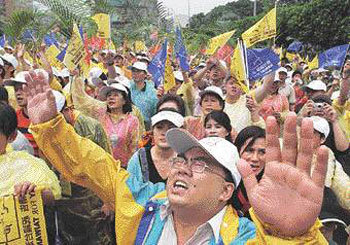 圖爲,今年6月數千名市民在臺北總統府前正舉行示威,要求陳水扁下臺。陳水扁因家人牽涉腐敗案和親信腐敗而受到下臺的壓力。