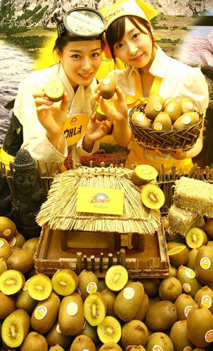 10日,在首爾龍山區漢江路3街易買得超市龍山站店舉行的品嘗活動中,售貨員推出了濟州産“金獼猴桃”。金獼猴桃中有獼猴桃、甜瓜、桃子等七種水果的味道。