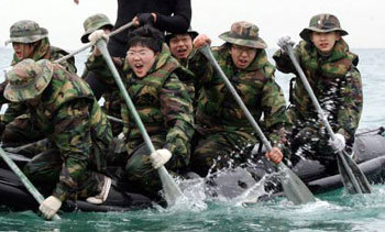 從中學生到成年人,共有300多人參加了16日在慶尚北道浦項市海軍部隊舉行的海軍部隊冬令營活動。圖爲,校外生正在海軍部隊演習場前海乘風破浪,接受劃橡皮艇的訓練。