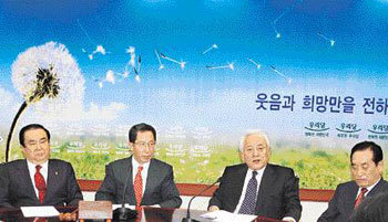 22日,在首爾永登浦辦公大樓舉行的開放的我們黨緊急對策委員會會議上,議長金槿泰(左二)等党領導人正面帶悲痛的表情。金槿泰提高聲音說:“應該立即中斷退黨、強力阻止(中央委員會的舉辦)、拒絕黨務等行爲。”