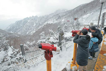在江原山區夜間降下的雪覆蓋了白頭大幹。圖爲,29日,遊客們在寒溪嶺山頂用望遠鏡欣賞雪景。