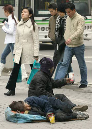 調查顯示,經濟快速發展的中國貧富差距達到嚴重的地步。圖爲,去年年底在上海一家大型購物中心前行人們來去匆匆,而旁邊有乞丐在乞討。