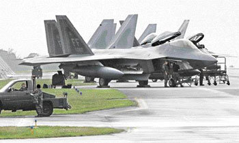 18일 일본 오키나와 현 가네다 미국 공군기지에서 모습을 드러낸 미 공군의 최신예 전투기 F-22(일명 랩터). 스텔스 기능은 물론이고 마하 1.58의 속도를 자랑하는 F-22는 F-15 전투기를 대체하기 위해 개발됐으며 미 본토가 아닌 해외 배치는 이번이 처음이다. F-22는 가네다 기지에 모두 10대가 배치됐으며 서너 달간 이곳에서 미군 및 일본 공군, 해군과 합동작전을 벌인다.