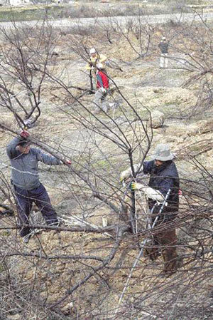 25日,日間最高氣溫升至零上10度,冬日天氣像春天一樣,在全羅北道井邑市長明洞附近的一個平原上,農民們正在挖掘要銷往大城市樹木市場的杏樹。這比往年提前了2~3周。