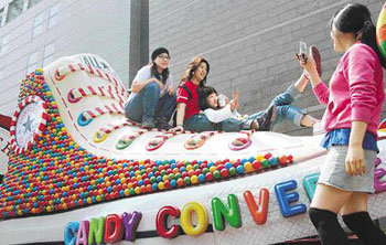 15日,首爾瑞草區盤浦洞新世界百貨商店江南店內展示了高2米、長3米的大型運動鞋,吸引了顧客的眼球。該運動鞋是模仿在全世界售出9億雙以上的“匡威全明星運動鞋”製作而成的,目的是用於宣傳。