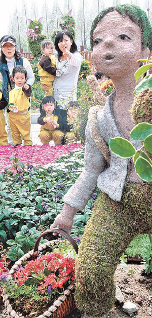 25日,在京畿道高陽市湖水公園舉行的高陽世界鮮花博覽會上,幼稚園的孩子們好奇地指著用鮮花做成的造型物。此次博覽會將舉行到5月20日,爲期26天,將展示用鮮花、矮草和青苔等做成的動物和人的造型的灌木修剪法,以及稍微一動就顫抖的“飄然蘭”等稀有鮮花。