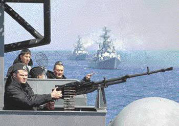 俄羅斯和印度於24日至26日在符拉迪沃斯托克沿岸的東海附近實施了聯合軍事演習“Indira2007”。圖爲,俄羅斯的“沙波什尼科夫海軍元帥”號大型反潛艦 26日載著高射炮實施演習。