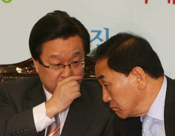 7日,在首爾江西區鹽倉洞黨支部舉行的最高委員會議上,大國家黨代表姜在涉和最高委員李在五交頭接耳,臉上露出嚴肅的表情。