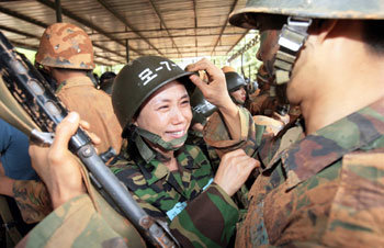 18日,一個訓練兵的母親來見在論山訓練所第27教育連隊兵營體驗活動中正在接受訓練的兒子。圖爲,當見到兒子的瞬間,這位母親立即熱淚盈眶。撫摸母親鋼盔的兒子的手勢和眼中,充滿了對母親的感激之情。