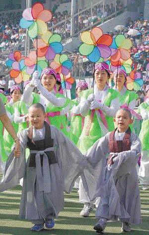 距佛誕日還有三天的20日,首爾東大門到鍾路區堅志洞曹溪寺的鍾路街頭出現了長長的提燈隊伍,其中包括龍燈、塔燈、白象燈、鳳凰燈、蓮花燈等10萬多個燃燈和數百個莊嚴燈。舉行提燈活動之前,在東大門運動場上舉行的準備活動中,參加活動的童子僧臉上滿是笑容。