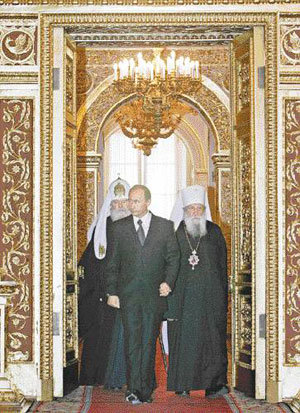 19日,爲慶祝1917年布爾什維克革命以後分裂的教會的重新統合,俄羅斯總統弗拉基米爾·普京(中)、俄羅斯正教會大主教亞歷山大二世(左)和海外俄羅斯正教會大主教拉夫勒(音)正一起走進在莫斯科克里姆林宮舉行的活動現場。
