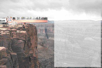 而人行天橋就是克服其局限的新設施。該設施考慮到了讓人們可以像鳥一樣在天上向下俯瞰。結構是這樣的。架設從峽谷邊緣開始水平地延伸21米的橋,其地面是由玻璃製造。因此站在橋上,就可以觀賞到峽谷的斷崖和1220米下的科羅拉多河,仍人産生在天上漫步的感覺。