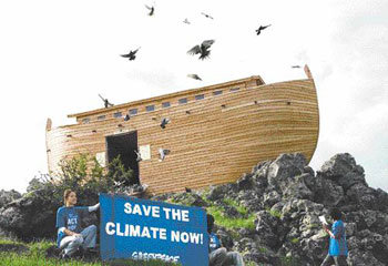 31日,國際環境團體“綠色和平組織”的成員在土耳其東部阿拉若山的山坡上,在完成的現代版諾亞方舟前舉著“請維持目前的氣候”的宣傳畫。據悉,阿拉若s是《舊約聖經》中的諾亞方舟經歷大洪水後停泊的地方。綠色和平組織爲了警告地球變暖導致生態系統遭到破壞的危險性,一直致力於重現諾亞方舟。