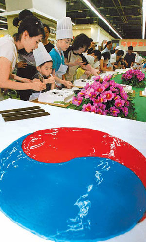 3日,在首爾瑞草區良才洞農協Hanaro俱樂部良才店內,孩子們正在用國產大米製作的蛋糕上畫太極旗。農協Hanaro俱樂部介紹稱,在迎來護國保勳月6月之際,爲了告知孩子們畫太極旗的方法並讓他們瞭解我國大米的寶貴,所以舉行了此次活動。