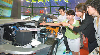 11日,在首爾江南區三成洞韓國貿易中心舉行的“國際環境技術展”中,觀衆們正在聽對液化石油氣(LPG)概念車的說明。用液化石油氣和電發動的這款新車可以大幅減少空氣污染。
