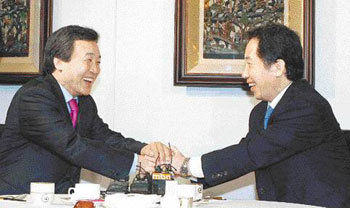 김근태 전 열린우리당 의장이 14일 서울 여의도의 한 호텔에서 범여권 대선후보로 거론되는 손학규 전 경기지사를 만나 악수하고 있다.