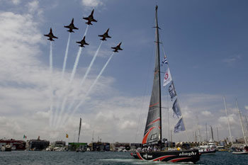 距離4年一次的世界頂級帆船大賽——第32屆美洲杯帆船賽還有一天的23日,瑞士飛行表演隊正在大賽舉行地西班牙巴賽隆納的前海上空,圍繞本國帆船“阿靈基”號飛行。此次大賽的賽制是,在上屆大賽上獲得冠軍的阿靈基隊和美洲杯挑戰者決定戰“路易威登杯”帆船大賽上勝出的新西蘭隊將以9戰5勝制爭奪冠軍。