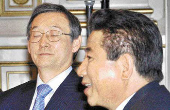 26日,在青瓦台和大學校長舉行的討論會上,盧武鉉總統(右)闡明了對首爾大學的制裁方針。因爲首爾大學想要對內申1、2等級做滿分處理。首爾大學校長李長茂輕輕地閉上眼睛聽總統發表言論。