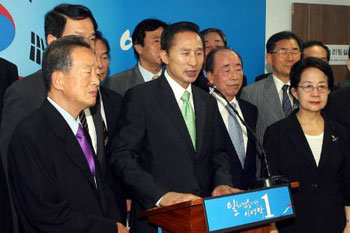 29日,前首爾市市長李明博在首爾汝矣島競選小組辦公室內發表講話,感謝前民主黨議員發表宣言支援自己。