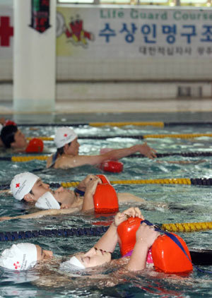 2日,大韓紅十字會光州全南分會在全南長城郡三溪面尚武台游泳場進行了海上人員救助教育。圖爲,學生們正在用游泳圈救落水者。