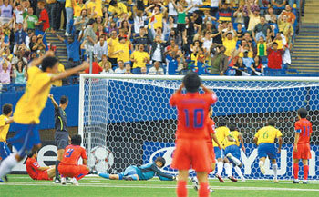 巴西隊被譽爲世界最強者並非浪得虛名。韓國隊的壓迫防守,在巴西選手眼花繚亂的帶球技術面前土崩瓦解。最終巴西隊的頭號射手亞曆山德羅·帕托在下半場第3分鐘和第14分鐘連續破門得分,將比分擴大到了3比0。