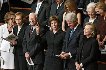 美國前總統林登·約翰遜的夫人伯德·約翰遜的葬禮於14日在故人畢業學校——德克薩斯州奧斯汀的德克薩斯大學舉行。現任總統夫人勞拉·布希女士(前排右三)在葬禮結束時做出了意味著學校象徵“長角牛(Longhorn)”的手勢。德克薩斯大學學生在給學校運動員助威時都會高呼“抓住犄角(Hook 'em, Horns!)”,並做出這個手勢。照片左起依次是南希•雷根女士、羅斯琳·卡特女士、美國前總統吉米·卡特、勞拉女士、前總統比爾·克林頓、參議院議員希拉裏·克林頓。