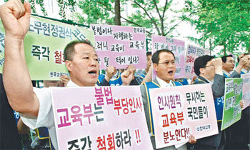 한국교원단체총연합회 회원들은 16일 서울 종로구 세종로 정부중앙청사 후문에 모여 청와대 파견 교사를 교육부 연구관으로 특별 임용하려는 교육부의 방침을 철회하라고 촉구했다.