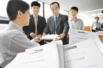 23日上午,京畿道河南市居民傳喚推進委員會的共同代表俞正俊(音,左三)、李明國(音,左二)等人來到河南市選舉管理委員會,提交了要求對河南市市長金晃植和3名市議員進行居民傳喚投票的簽名冊。
