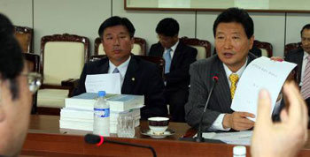 大國家黨的粉碎政治工作之范國民鬥爭委員會在2日上午訪問了建設交通部,對大運河報告書的製作經過和向外洩露過程進行了調查。安常樹委員長(右)向李勇薛建交部長官詢問報告書的製作意圖等問題。