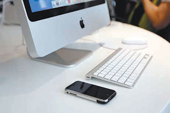 7日(当地时间)位于美国加利福尼亚州的苹果总公司的最高经营者(CEO)Steve Jobs, 介绍了多媒体苹果LICATION產品“I life 08”,新型PC“I Mac”、“I work 08”(右)。帶有鋁材質超薄型鍵盤的新iMac有20英寸和24英寸的兩款,並根據產品品種分別定價為1199美元~1799美元。