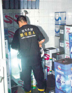 10日, 儀旺市高千洞W產業火災現場。為了查明火災發生的原因,一名消防官正在勘查堆積化工藥品的倉庫。9日下午,這個公司發生火災,導致6名女職員死亡,2名重傷。