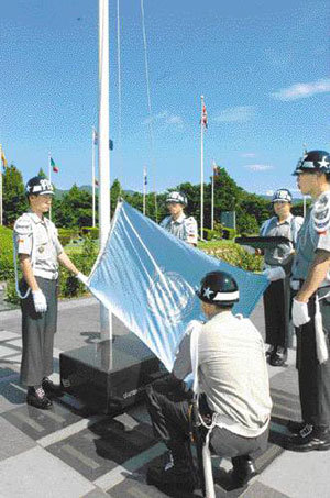 陸軍53師團所屬士兵們21日在釜山南區大然洞聯合國紀念公園舉行聯合國國旗升旗儀式。 根據聯合國紀念公園管理委員會的邀請, 國防部從這個月開始派遣士兵到聯合國紀念公園,支援警戒工作,獻花等一系列活動。