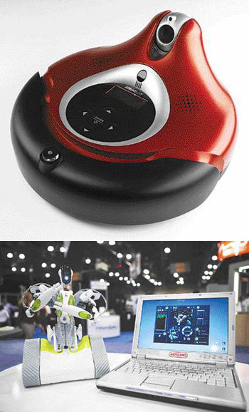 27日(當地時間),在美國紐約進行的消費者家電“數碼生活”展示會上展示了多樣的生活型機器人。間諜機器人“Spy Key”內藏音箱收信機和錄影攝影機。可以把左邊的機器人發送到任何地方,接收聲音和影像(上)。美國的I機器人公司具有攝像機和聲音接收的功能,還以與家庭可以交流的“假像訪問機器人”(下左)和可以擦窗戶的專用機器人(下右)而出名。