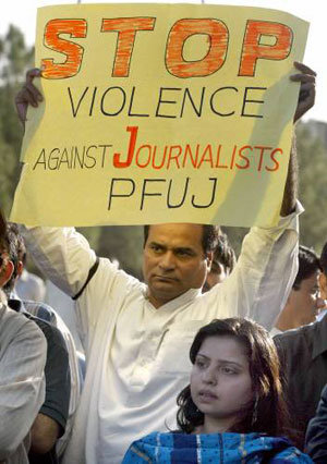 上個月30日,在巴基斯坦的首都伊斯蘭堡,巴基斯坦的記者們對反政府示威的員警過當鎮壓表示抗議。之前上個月28日,29日,在巴基斯坦各地都舉行了抗議現任總統穆沙拉夫參加將在6日實施的下一屆大選的示威。遭受員警的暴力不斷出現犧牲者,採訪記者們也遭到暴行,因此巴基斯坦記者聯盟把這一天宣佈為“黑暗之日”。