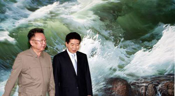 3日,正在朝鮮進行訪問的盧武鉉總統(右邊)在住處平壤百花園迎賓館,以波濤洶湧的大型壁畫為背景與金正日國防委員長攝像留念之後,為進行正常會談離開了住處。