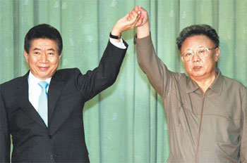 4日,盧武鉉總統與金正日國防委員長在平壤百花園迎賓館共同簽署《南北共同宣言》後共同舉起了雙手。
