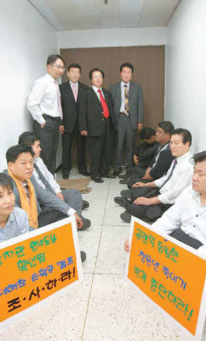 前開放我們党議長鄭東泳的支持者們為了阻止員警的搜查于6日在首爾汝矣島大河樓入口守候。