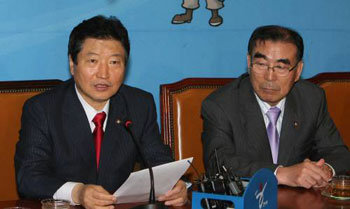 19日,大國家党院內代表安商守(左)在國會召開的黨院內對策會議中批評道:“盧武鉉總統還在繼續宣揚干涉總統選舉的發言。”