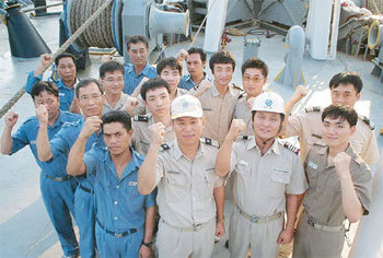 韓振洛杉磯號抵達中國深圳港的25日,包括洪意文(前排左起第二)船長的船員們高喊了“我們走向五大洋六大洲”的口號。在深圳港裝載中國產傢俱、服裝、玩具等的韓振洛杉磯號,將為迎合“耶誕節”會在11月下旬抵達美國洛杉磯。
