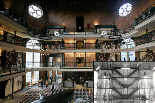就像描述汽車變成機器人的電影《變形金鋼》那樣,美國波斯噸監獄(右)變成了最高級賓館。5日公開的波斯噸Liberty賓館(上)原來在1848年到1851年間曾使用成監獄,但最近5年間它以1億5000萬美元的投資重整了內部裝飾,以脫胎換骨的姿態重新展現在了人們的面前。Liberty賓館充分發揮了罪犯們使用過的狹窄的上層通道,儘量發揮了異國體驗特色。