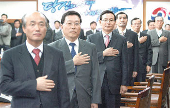 19日,參加京畿果川市中央選舉管理委員會會議室中召開的“全國市道選舉管理委員長會議”的參與者,正向國旗敬禮。
