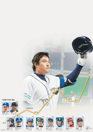 FA制度從2000年(1999年末的資格公告)開始施行。那年金東洙(LG→三星)和李康哲(HAITAI→三星)包括選擇權簽約3年8億韓元的時候,“FA火爆”表現隨即黯然失色。急劇暴漲的FA身價不過5年就上升到了60億韓元(沈正洙)。