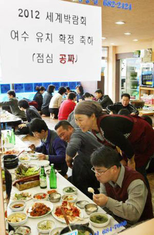 為了慶祝麗水成為了2012年世界博覽會的舉辦地,全南麗水市廳對面的一家韓國飯店,27日實行了免費提供午餐的活動。