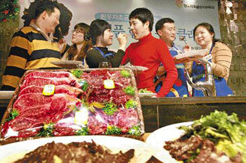 2日首爾西大門區滄川洞現代百貨店新村店中,由“韓宇自助金管理委員會”主辦的“名品韓宇烹飪”活動中,情侶們給自己的伴侶品嘗自己親手製作的韓宇料理,享受著快樂時光。