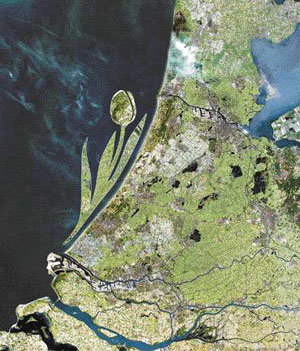 一位藝術家在衛星照片中表現了荷蘭前海的“鬱金香島”構想圖。在世界上圍墾技術最發達的荷蘭,為了解決人口過密,保護海平面上升而破壞的海岸,正在計畫沿海建造人工島。