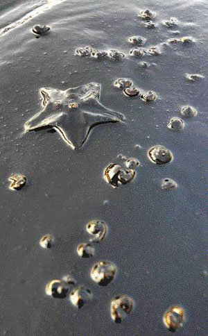 海、生物、人、生活都在漸漸變黑。發生石油流出事件已經是第4天的10號,中南泰安群萬里浦海水浴場到處可以發現被石油淹死的黑色海星和魚類。
