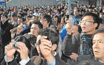 9日一位大選候選人在首爾站進行了遊街宣傳,聽眾們正在用數碼相機和移動電話進行拍照。這樣的景象對於有力候選人員來說是常見的。