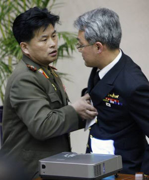 14日,在板門店韓國方地區“和平之家”召開的第7次首腦級軍事會晤中,朝鮮的某隨行人員(左),正在用身體力推想關掉平行光束頭設器的韓國方軍官。