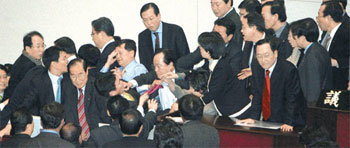 大國家党議員們為了阻止14日“BBK控股調查檢察院彈劾案”和“李明博特檢法”的處理,佔據了國會主會議場主席臺的周圍,大統一民主新党議員們為了把他們趕下來進行了“搏鬥”。